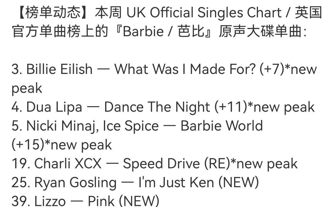 此外,在上周的英国单曲榜单中,《芭比》OST专辑更是达成一定的小范围“洗榜”,共有6首单曲均打入前39名,其中Billie Eilish献唱的《What Was I Made For?》更位列第三名。