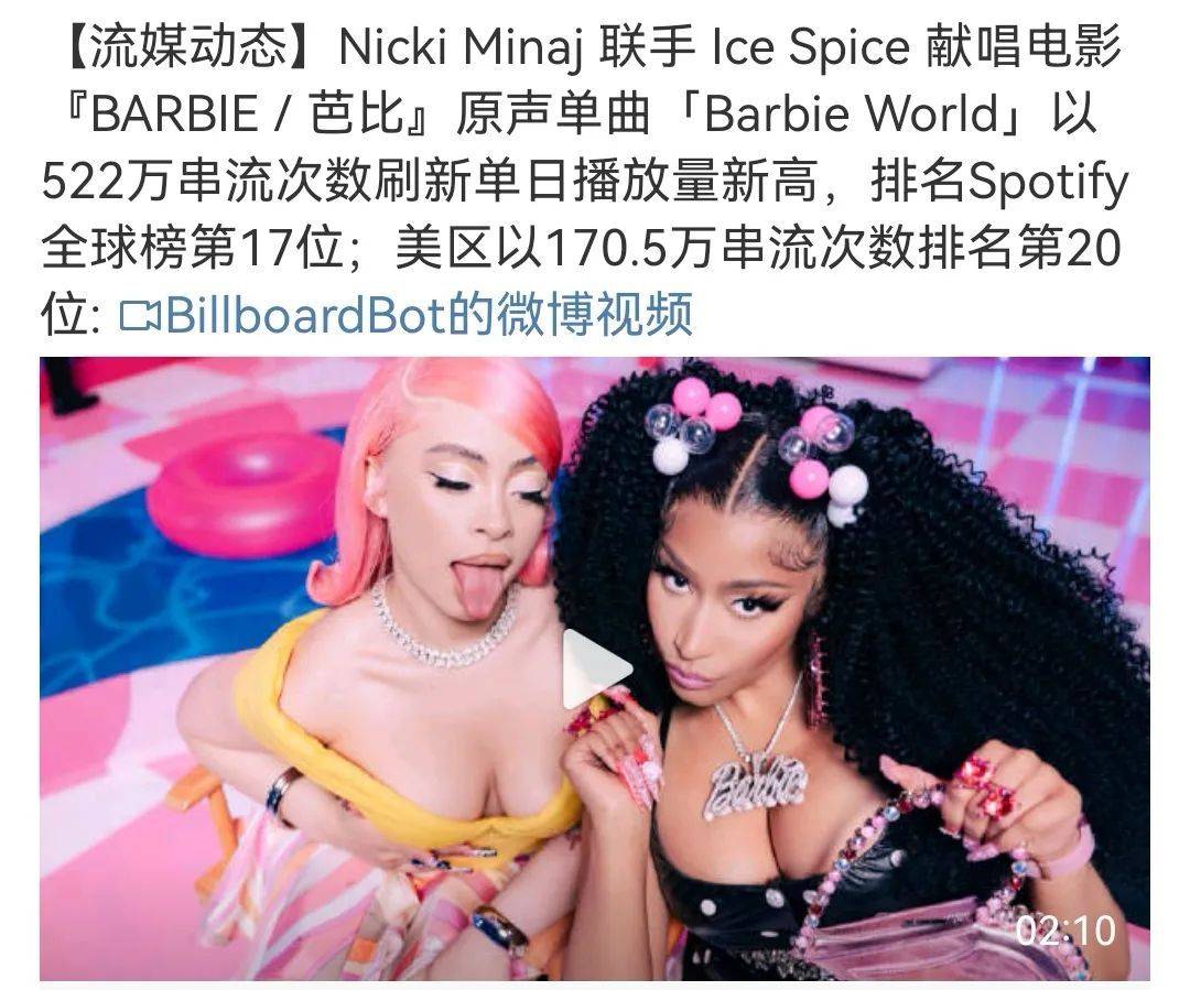 其中,OST专辑中由Nick Minaj、Ice Spice、Aqua合作的《Barbie World》表现尤为亮眼。早在7月初,这首歌便已以空降Billboard Hot 100第七位的成绩,持平Aqua采样原曲《Barbie Girl》的纪录,近期成功凭借电影带来的流媒体效应,高歌猛进杀回本周Billboard Hot 100前十。