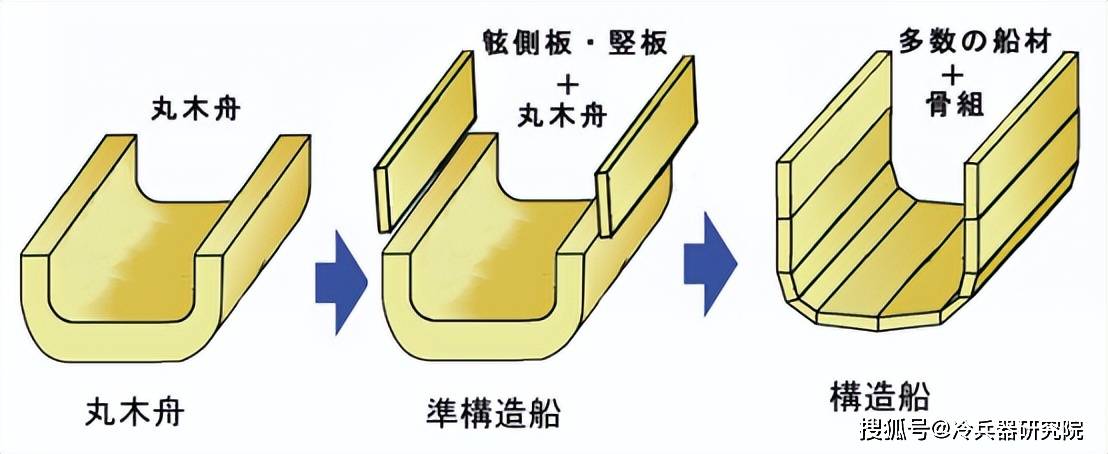 而随着航海技术进步,要求造船工匠建造更大的船,仅使用大木材建造大型独木舟是不可能的,因此弥生时代之后(也就是大约中国汉代之后),往往使用大木材作船底,在两边布置舷板,这就是所谓的“准构造船”。