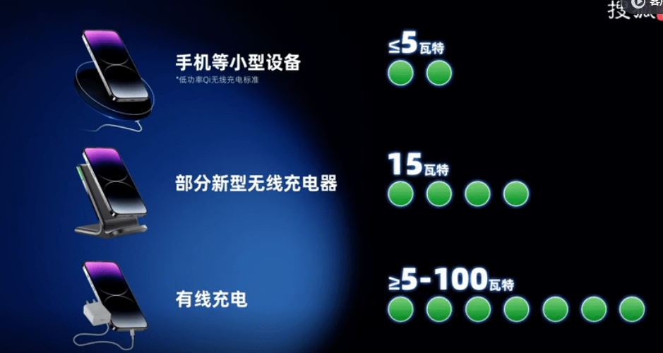 无线充电虽然摆脱了线缆限制,但充电较慢。根据无线充电联盟(Wireless Power Consortium)Qi v1.3标准,目前手机等小型设备通常采用低功率Qi无线充电标准,充电功率一般在5瓦特或以下 , 一些新型的无线充电器也支持更高功率,比如15瓦特,而有线充电功率在5-100瓦特以上。