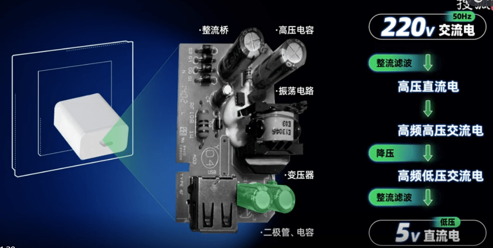 一般的有线充电,电流在通过充电器时,首先整流桥和高压电容会对电流进行整流滤波,变成高压直流电,之后高频振荡电路将它转化为高频高压交流电, 紧接着变压器出场对电流进行降压,变为高频低压交流电,最后再经二极管和电容的整流滤波,就得到了5V直流电。