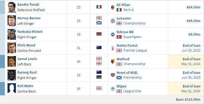 纽卡今夏引援已经花费了1.16亿欧。