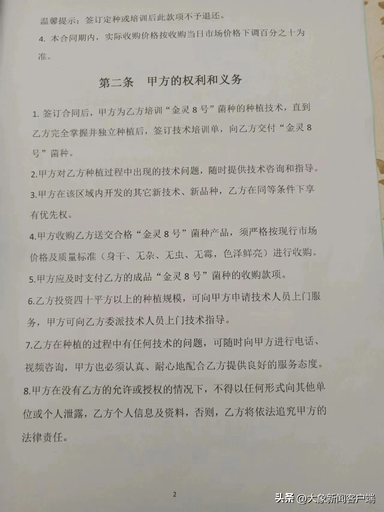 如河南创拓农业发展有限公司和种植户签订的合同中,第二条甲方的权利和义务第四项:甲方收购乙方送交合格“金灵 8号”菌种产品,须严格按现行市场价格及质量标准(身干、无杂、无虫、无霉,色泽鲜亮)进行收购。
