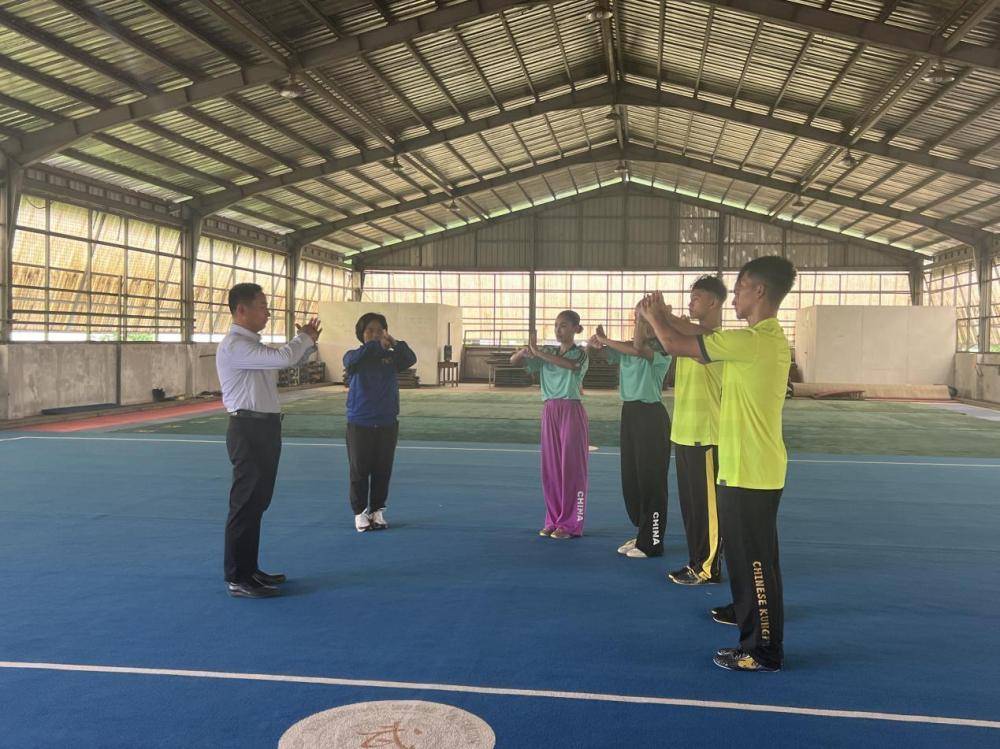 缅甸国家武术联合会主席李伯波(穿白色衬衣者)指导队员训练