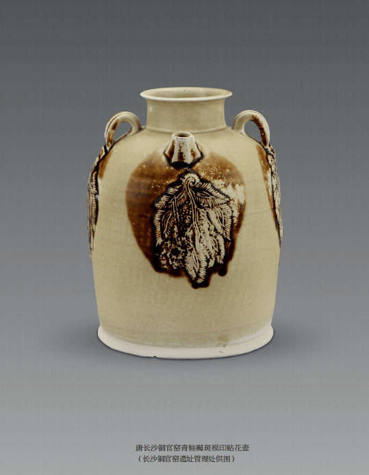 一件青釉褐斑模印贴花壶上的贴塑花纹被称为“椰枣纹”, 它取材自西亚广泛种植的椰枣树。