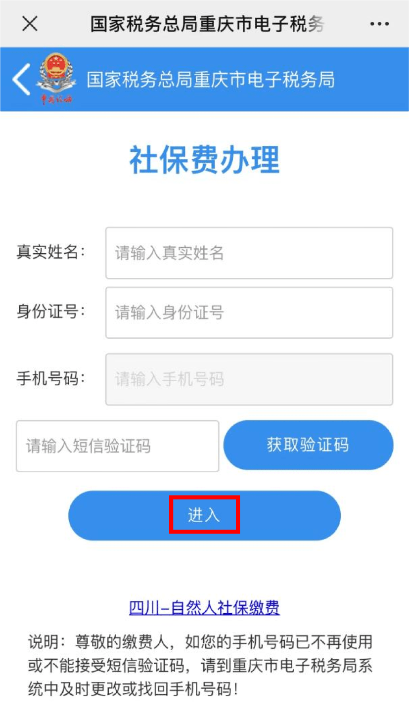 微信搜索“重庆税务”公众号,点击【网上办税】-【个人社保】,输入姓名、身份证号、手机号码、验证码等信息后,点击【进入】即可跳转至重庆市电子税务局页面。
