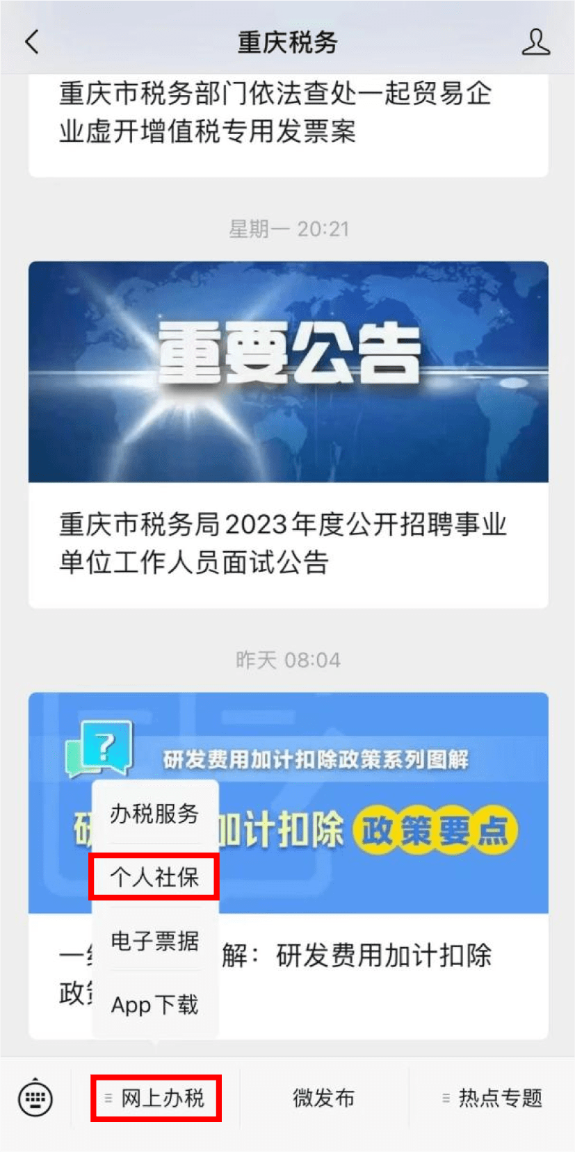 小编以“重庆税务”微信公众号为例,介绍灵活就业人员缴纳养老保险费操作流程。