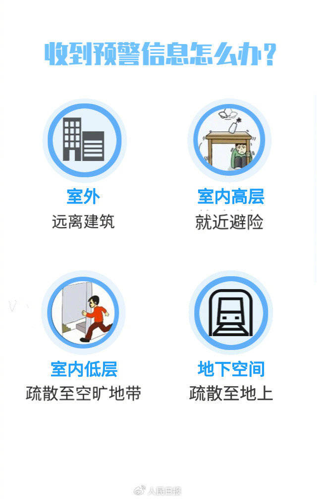 注意,地震预警并不是地震预报,而是警报。收到预警信息,表明已经地震了。它指的是在地震发生后,迅速向破坏性地震波尚未到达区域发出避险警报,一般只有几秒至几十秒,主要是为了一些特殊行业、公众争取紧急处置、避难逃生时间。不过,地震预警也有局限性。越接近震中的地区预警时间越短。收到以后,广大市民一定要保持沉着冷静,通过图片、灯光报警、声音报警、语音提示等,正确辨识地震预警信息,结合所处的环境采取相应的避险措施。