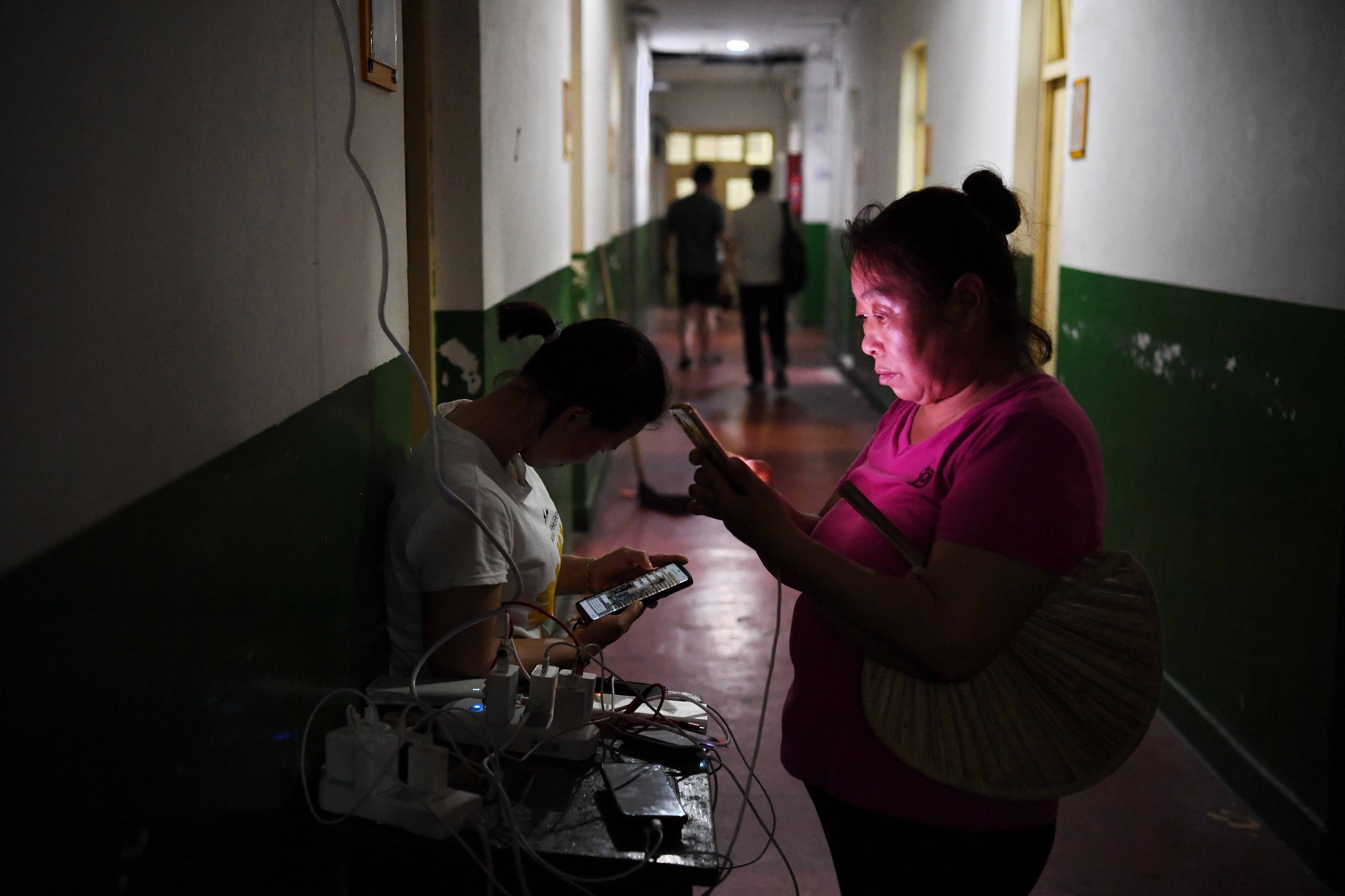 8月1日,安置群众在河北省涿州市职教中心安置点内给手机充电 图片来源:新华社