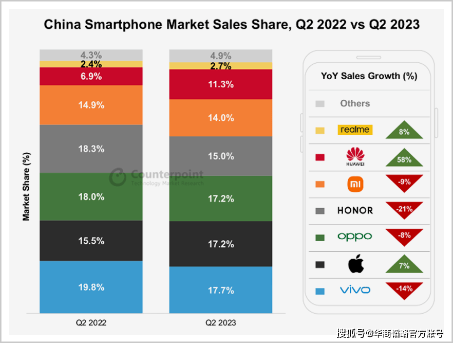 根据Counterpoint Research的数据,在全球手机销量下滑的2023年第二季度,华为手机销量逆势增长58%。