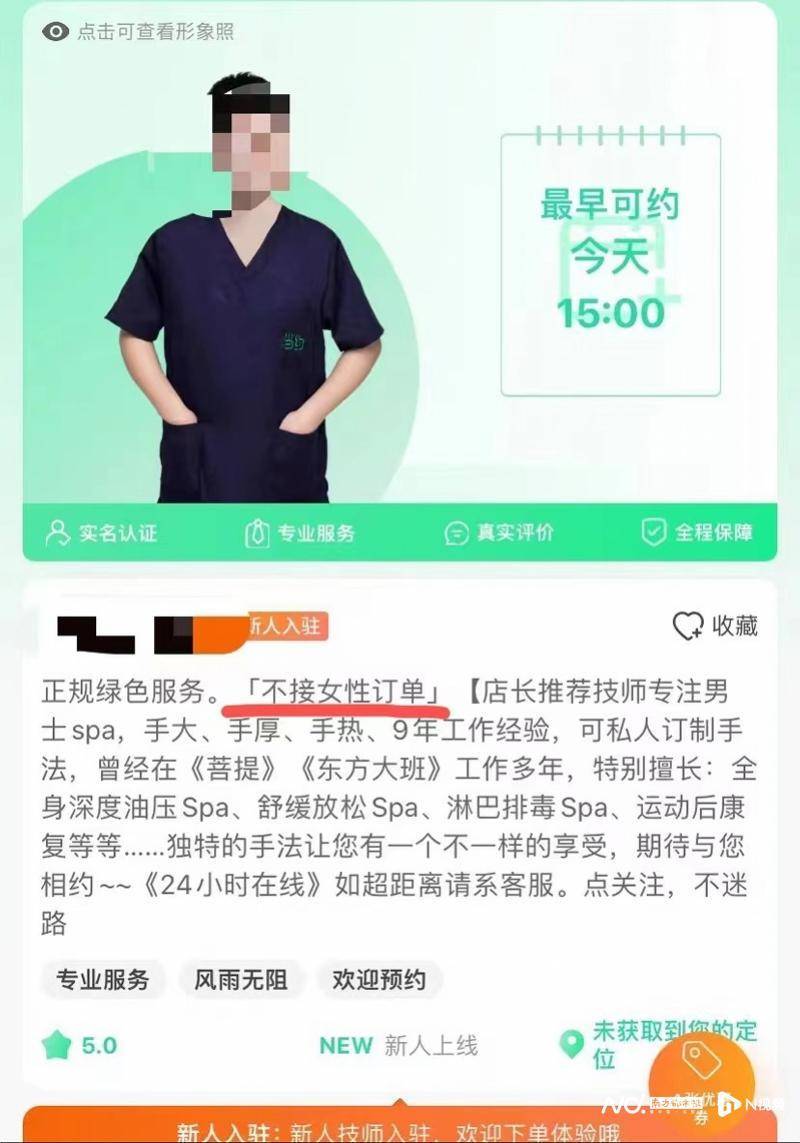 在另一个上门按摩APP,记者发现在技师选择页面中,技师介绍的首句话均为“正规绿色服务”。而在男技师的选择页面中,更有直接点名“不接女性订单”。