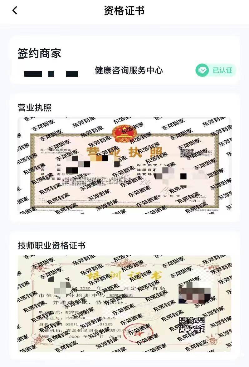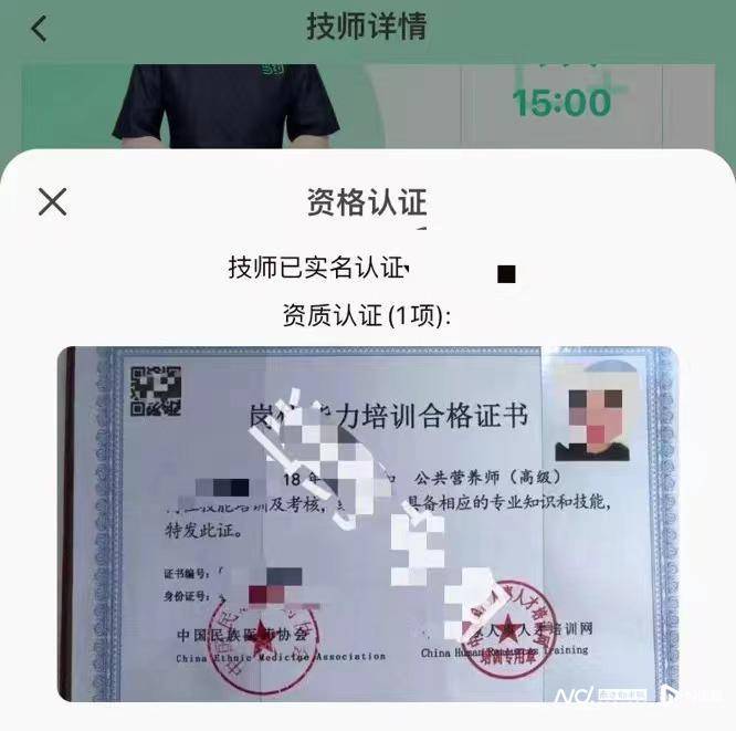记者随意点进一位服务技师的页面,发现每个技师都有一个“签约商家”,或为健康咨询服务中心、或为保健按摩经营部等,页面会上传营业执照,部分技师会上传能证明自己“实力”的证书,或为某就业培训中心的培训证书、或为医疗保健行业专项人才技能证书、标准化考试认证职业技能证书等。各类证书,层出不穷。