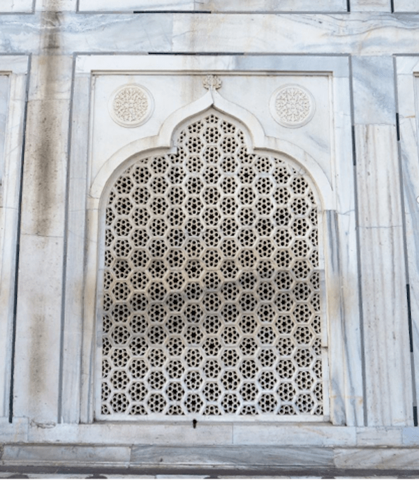 Jaali(贾利)在印度是“网”的意思,在建筑上,以砖、水泥、陶土为材料,通过错综复杂的排列组合成美丽的格状屏风,同时为室内遮阳通风。目前印度现存的“贾利”建筑作品最早可以追溯到12世纪初,著名的泰姬陵就有大量的大理石贾利。