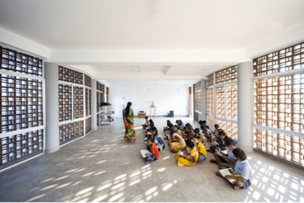 贾利并不是只存在于古建筑上的装饰,它散热降温的优势也应用在了印度现代的建筑中。2019年落成的Sharana日托中心就采用了大量的陶土贾利作为外墙,不仅简化了施工过程、增加通风透气,也让这个促进教育平等的空间保持开放,让外面的人也能看到里面的学生活动情况。