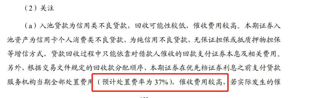 在项目说明书中,中信银行表示,该项目入池贷款为信用类不良贷款,回收可能性较低,催收费用较高,本期证券在优先档证券利息之前支付贷款服务机构当期全部处置费用(预计处置费率为37%),催收费用较高,若实际发生的催收费用大于预计的催收费用,本期证券优先档正常兑付将存在一定风险。