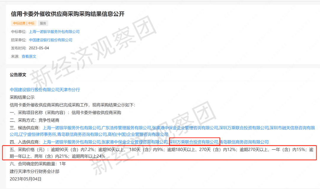 而在建设银行天津分行今年5月份公布的《信用卡委外催收供应商采购采购结果信息公开》中,入选的供应商有一诺银华、张家港中保金企业管理咨询有限公司、万乘联合、青岛联信等4家。