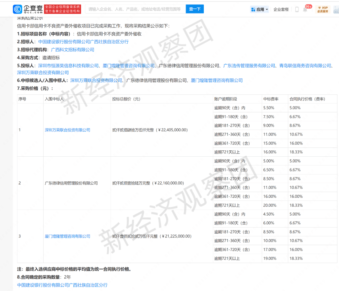 其中,2022年7月13日,中国建设银行四川省分行(以下简称“建行四川分行”)公布了《中国建设银行四川省分行2022年信用卡逾期欠款委外催收业务采购项目中标公告》(以下简称《建行公告》)。