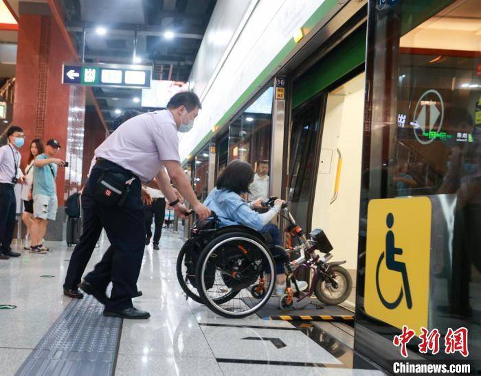 图为地铁工作人员帮助使用轮椅的乘客乘车。中新社记者贾天勇摄