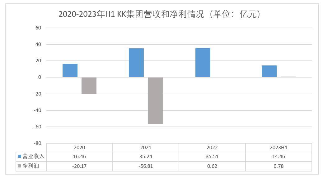 招股书显示,2020年-2023年一季度(以下简称报告期),KK集团分别实现营收16.46亿元、35.24亿元、35.51亿元和14.46亿元;净利润分别为-20.17亿元、-56.81亿元、0.62亿元及0.78亿元。由此计算可知,其三年多已累亏75.58亿元。