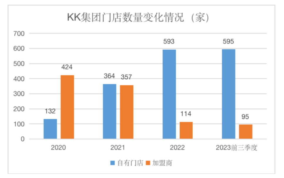 除了在线下零售门店建设外,KK集团还不断大规模扩充自有门店数量。招股书显示,截至2023年3月31日,KK集团旗下自有门店总数较2020年的132家增长高达350.76%,达595家。
