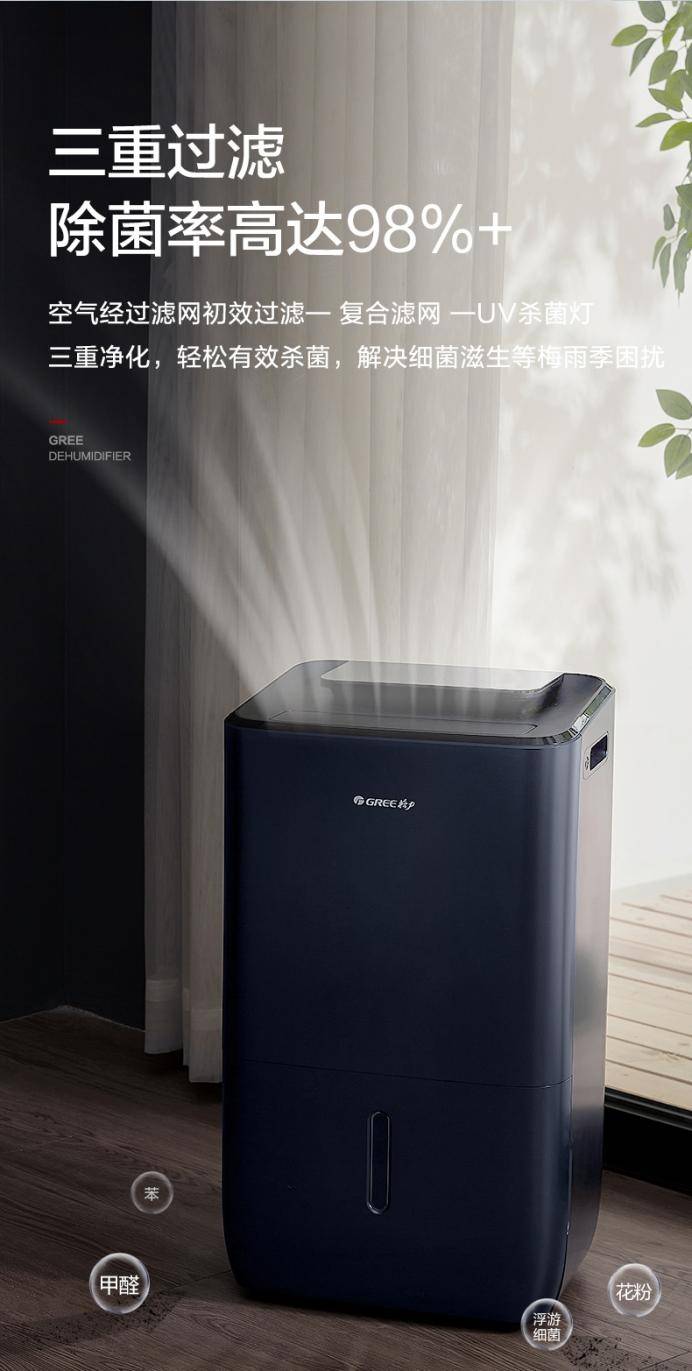 在除湿的同时,它还能兼具除菌功能。要知道雨季是最容易滋生细菌,导致角落发霉的。而格力除湿机搭载三重过滤系统:初始滤网直接过滤掉空气中的大颗粒,防止机子堵塞;第二层采用HEPA+活性炭复合滤网,可过滤掉细微颗粒;第三层内置LED紫外灯,通过UV紫外线杀菌,可强力破坏细菌和病毒生物结构。除菌率高达98%以上,空气净化效果亲身有感,再也不用担心雨季“倒霉”困扰啦!