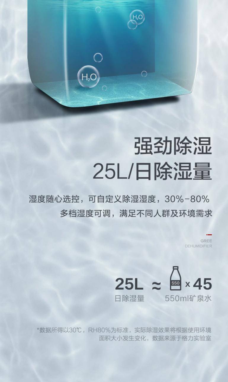 要说这款格力除湿机的厉害之处就在于它能够三效合一。首先,它具备强劲的除湿功能,具有25L/日的除湿量,相当于一天可除湿45瓶550ml的矿泉水,水汽无处遁形。同时,它还能随心选控湿度,自定义你想要的最佳湿度。不管是“缺水”的干皮人群,还是重湿气人群,在格力除湿机30%-80%多档可调湿度下,都能给自己找到舒适的状态~