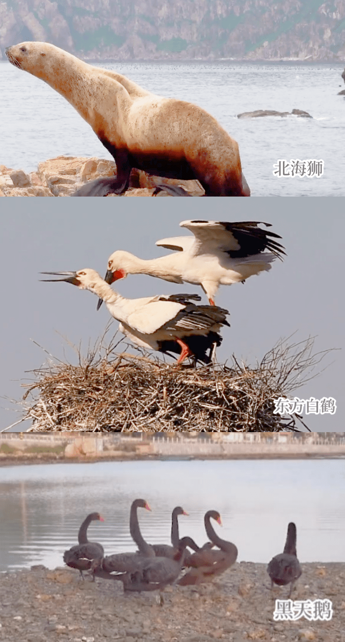 不仅是斑海豹“定居”长岛,白江豚、鲸鱼等高级海洋生物也频频出现,北海狮、黑天鹅首次出现,东方白鹳、黄嘴白鹭、苍鹰等迁徙鸟类数量明显多于往年。甚至多年未见的大叶藻等藻类也在海岸丛生。
