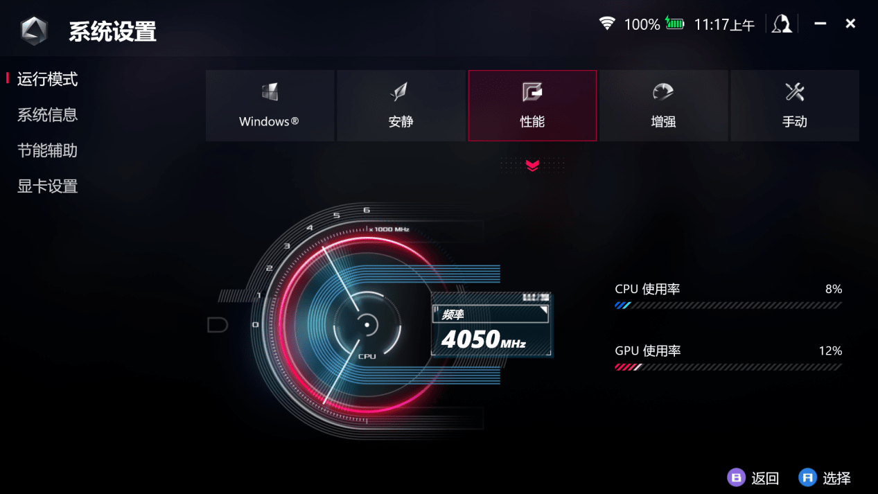 如果对性能有看法,也可以调节ROG掌机的功耗挡位,目前奥创中心SE共有10W/15W/25W/30W(需插电)/手动模式五个档位可选,手动模式里面甚至可以自由调节功耗以及手动拉取风扇曲线。