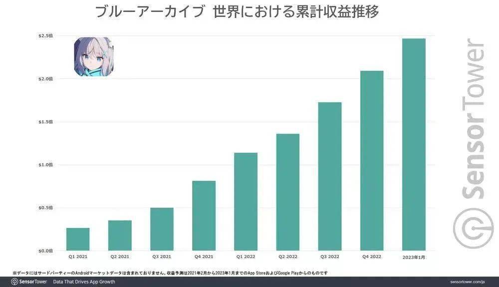 2021年日区开服一度跌出iOS畅销榜300名,到现在成为畅销榜TOP20常客;而SensorTower数据指出,《蔚蓝档案》2023年1月营收水平在日服就增长2.7倍以上,DUA突破50万。