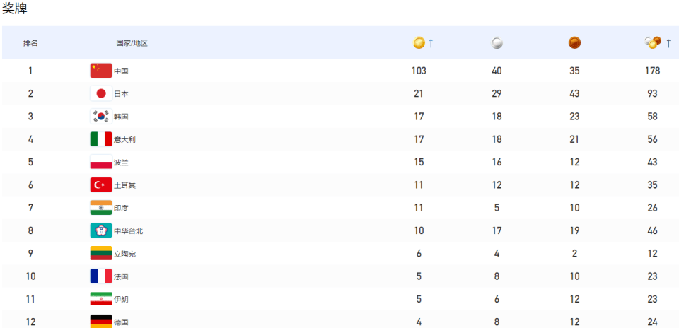 大运会第10个比赛日,中国队单日再夺13金。金牌榜和奖牌榜上,中国队以103金40银35铜高居第1,日本队以21金29银43铜排在第2,韩国队以17金18银23铜排在第3,美国队以1金排在第24。