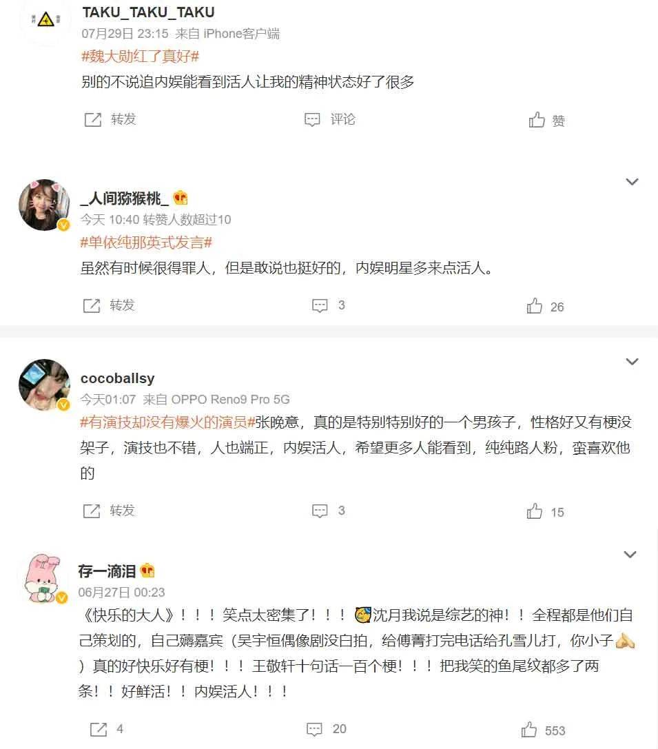 比如在魏大勋爆火之后,很多网友考古他的微博发现大勋花早期各种有趣发言,努力工作,认真减肥、学英语的状态和当代年轻人一模一样;也有很多人呼吁内娱多一些真实做自己的“活人”,“让我追星精神状态都好了很多”。