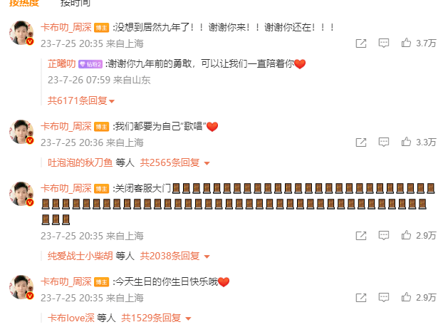 做微博超话客服方面,我们周深可是最擅长,每一条微博评论区都是真正的“抢沙发大战”,送生日祝福、有爱互怼以及提醒大家防暑降温,已经成为周深和歌迷之间的日常,每次临走深深子还不忘发“关闭客服大门”的留言提醒,贴心客服尽职尽责。