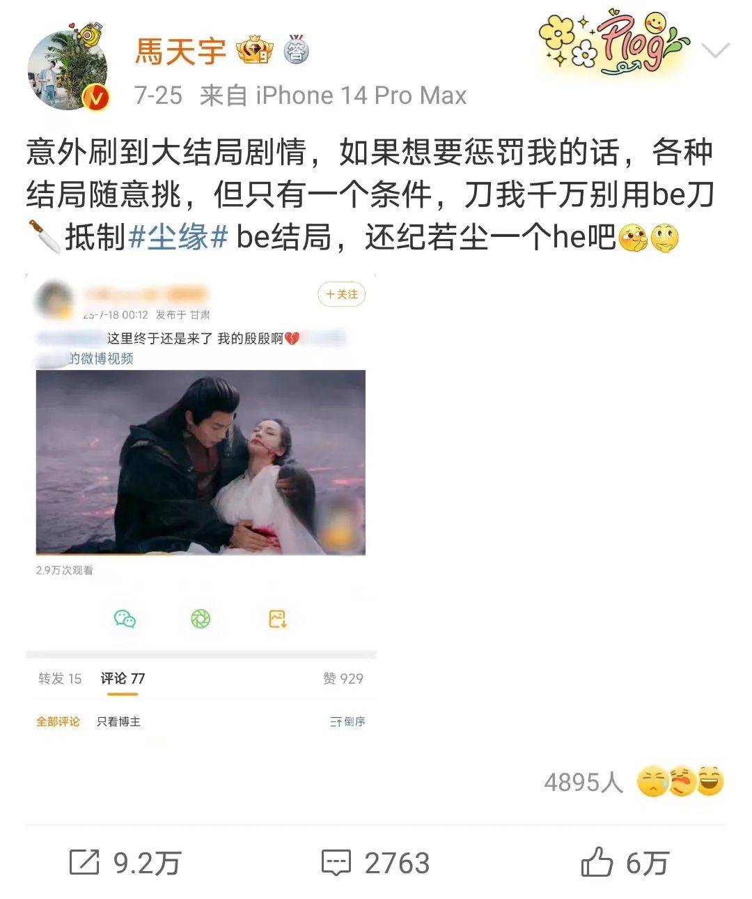 时隔7年,马天宇为《尘缘》重新打开了微博评论区,甚至与激情追剧的网友们一起抵制《尘缘》be结局。