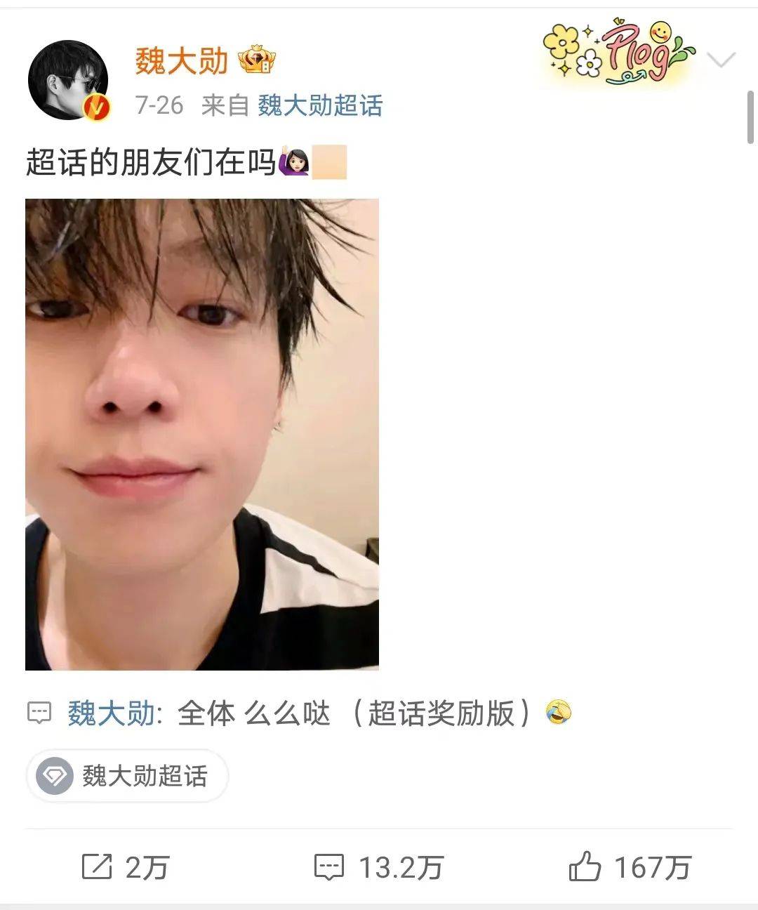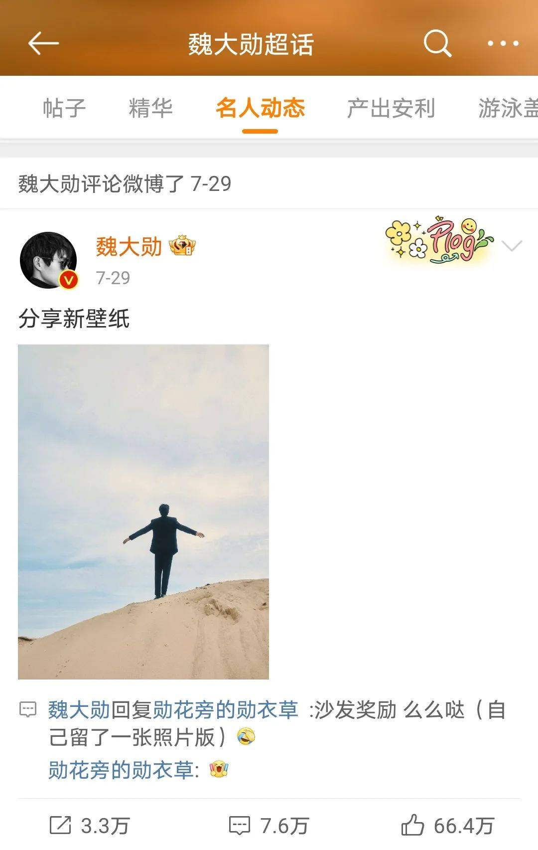 作为玩转超话的小能手,魏大勋不仅自己当过超话主持人,让xyy“超话格式了解一下”。超话生日还专门去空降云分蛋糕!现在因为粉丝千呼万唤还专门在超话粉丝破100w时给每个⼈送了“么么哒”(超话奖励版),并一口气回复十多条评论。