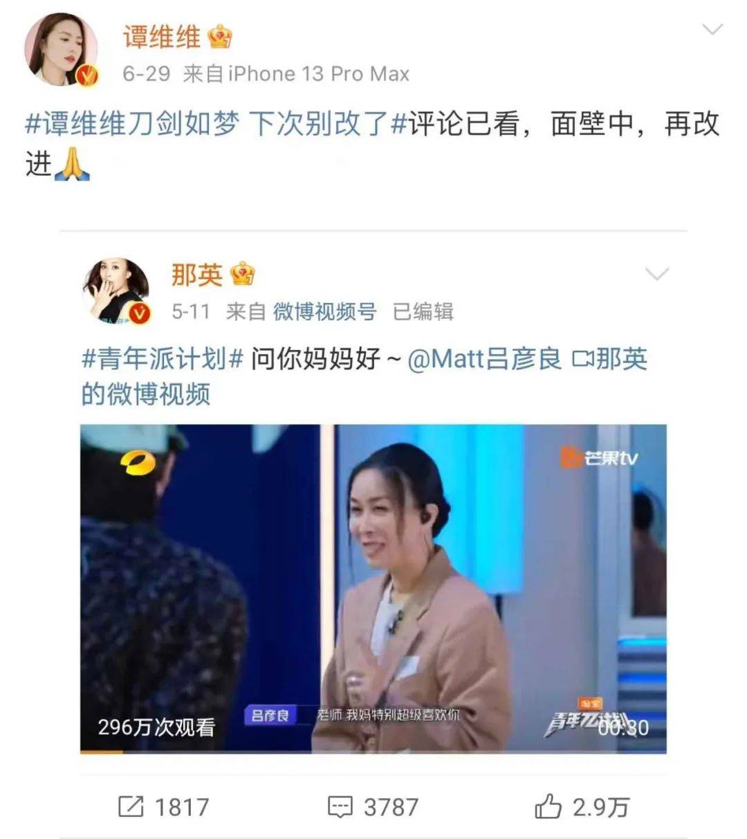 在改编的《刀剑如梦》舞台受到网友吐槽后,谭维维当晚就在微博大方回应改编问题,“评论已看,面壁中,再改进”;那英“你妈”梗火遍全网,一向心直口快的那姐专门发博打出全句“问你妈妈好”,那姐的嘴算是被管住了!