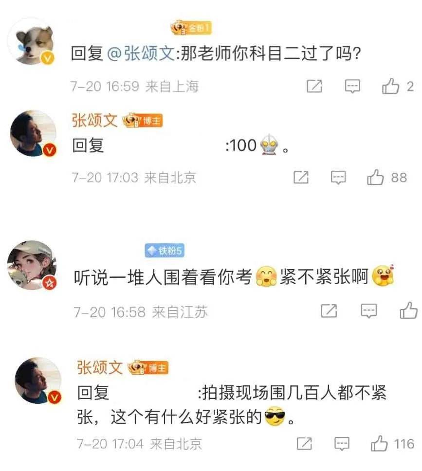 微博上的张颂文从来都是真诚又可爱,回复网友如同唠家常。前段时间考科目二被围观,通过之后就向大家汇报自己考了100分。有网友问被围观紧不紧张,颂文老师主打一个从容不迫,“拍摄现场几百人都不紧张,这个有什么好紧张的~”