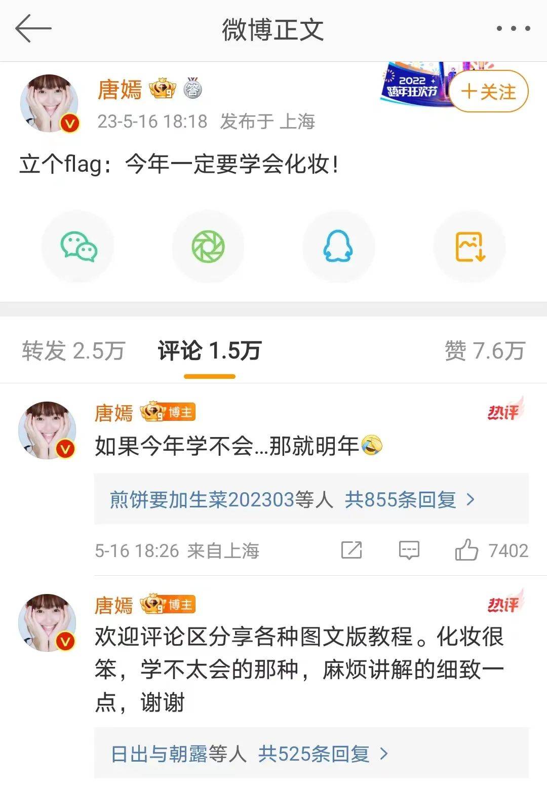 唐嫣说今年一定要学会化妆,并在评论区收集化妆技巧,“如果今年学不会那就明年”的捂脸表情,像极了叨叨身边天天嚷嚷减肥、但嘴上不停的闺蜜小姐妹。