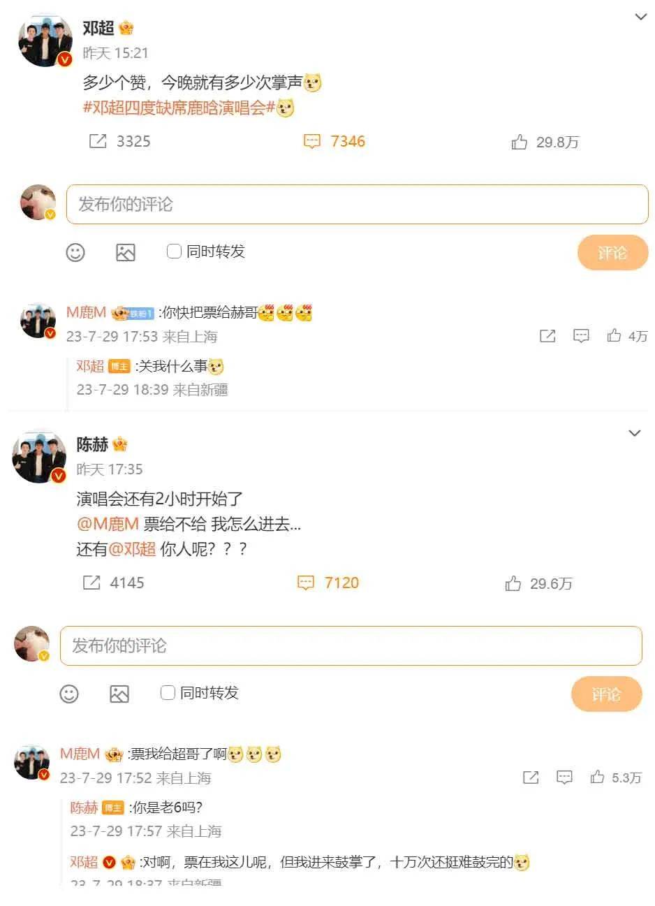 上周末四度缺席鹿晗演唱会的邓超又拿陈赫开涮了,鹿晗把给陈赫的票让超哥转交,结果陈赫在外面干等票,超哥忙着发微博应援,“多少个赞,今晚就有多少次掌声!”