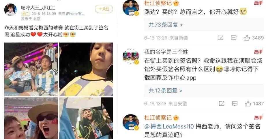 梅西来华比赛轰动全网,众多明星也在微博追星:内娱梅西粉丝人均喜剧人,嗯哼看完球赛在路边买梅西签名照,杜江直接微博艾特本尊,“梅西老师,请问这个签名是您的真迹吗?”