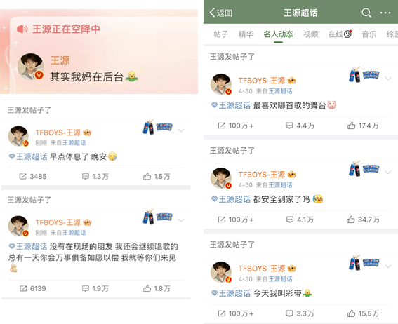在 #王源爸妈不在的演唱会状态# 话题热1上榜后,王源当晚就在超话发帖回应网友热议,“我妈其实在后台”,很快相关话题词也登上微博热搜。
