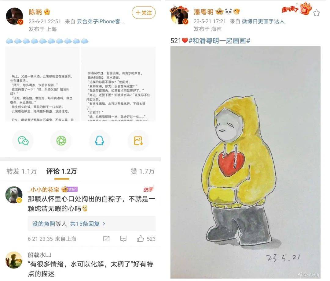 万万没想到写手画手竟然隐藏在娱乐圈!微博小说连更让陈晓变成了“陈晓大大”,喜欢熊猫的潘粤明不定期掉落熊猫涂鸦,还发起#和潘粤明一起画画# 的活动,收集粉丝们的创作。