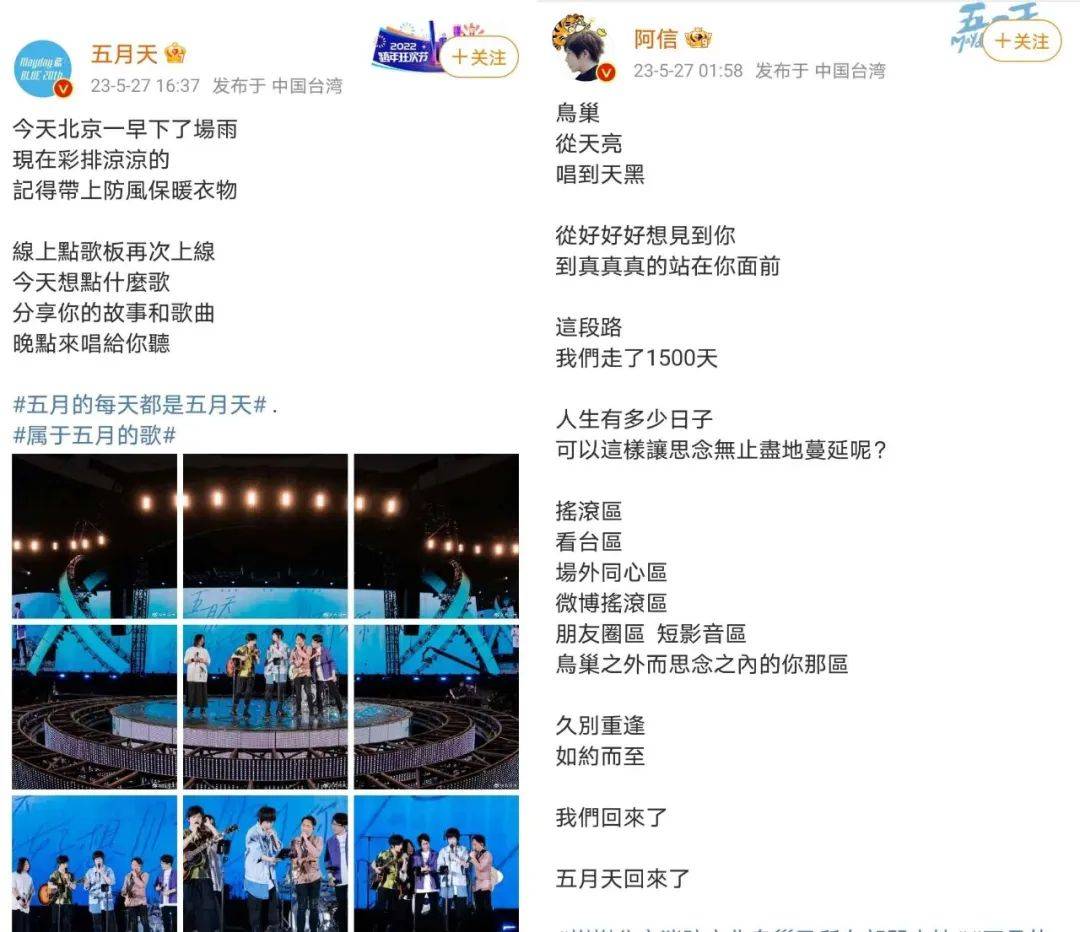 五月天在多场演唱会开放微博“线上点歌台”,“今天想点什么歌,分享你的故事和歌曲,晚点来唱给你听”,也太暖心了!现场实时抽取评论区歌迷满足大家的点歌心愿,阿信还专门发微博感谢“微博摇滚区”的朋友们;