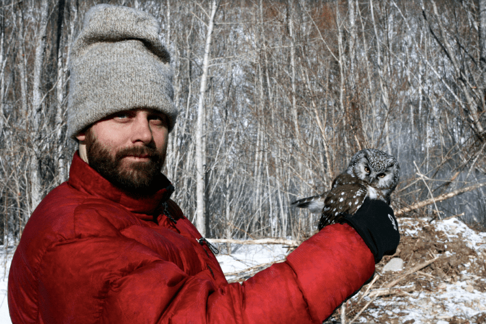 2008年,斯拉特和一只腾格姆猫头鹰在一起。他觉得这只鸟像一个看起来很严肃的纸杯蛋糕。图片提供:乔纳森·斯拉特。