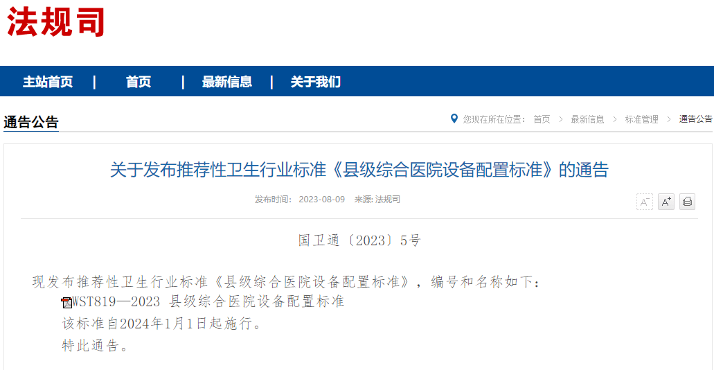 《县级综合医院设备配置标准》已于近日公布,该《标准》适用于不超过1500床位规模的县级综合医院,且自2024年1月1日实施。