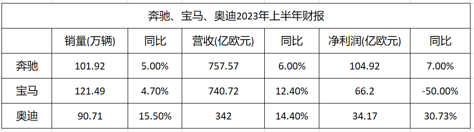 从BBA三家的财报内容可以看出,最稳定的还是奔驰。尽管从销量上看,奔驰略输宝马,上半年全球累计销量为101.92万辆,但是奔驰的营收达到了757.57亿欧元,同比增长6%,净利润104.92亿欧元,同比增长7%,是三家当中唯一一个实现营业收入与净利润双增长的。在新能源转型阶段,能够做到营收和利润双增长的车企,放眼全球也并不多见。