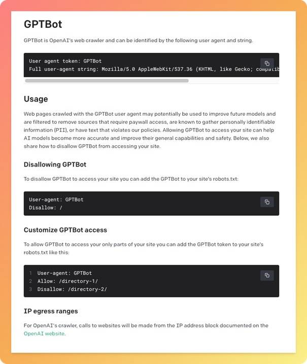 当地时间8月8日(周二),OpenAI在官网介绍了新产品GPTBot,这是一种网络爬虫,可大规模爬取网络数据用于训练AI模型,据称可以用来改进未来的聊天机器人大模型。