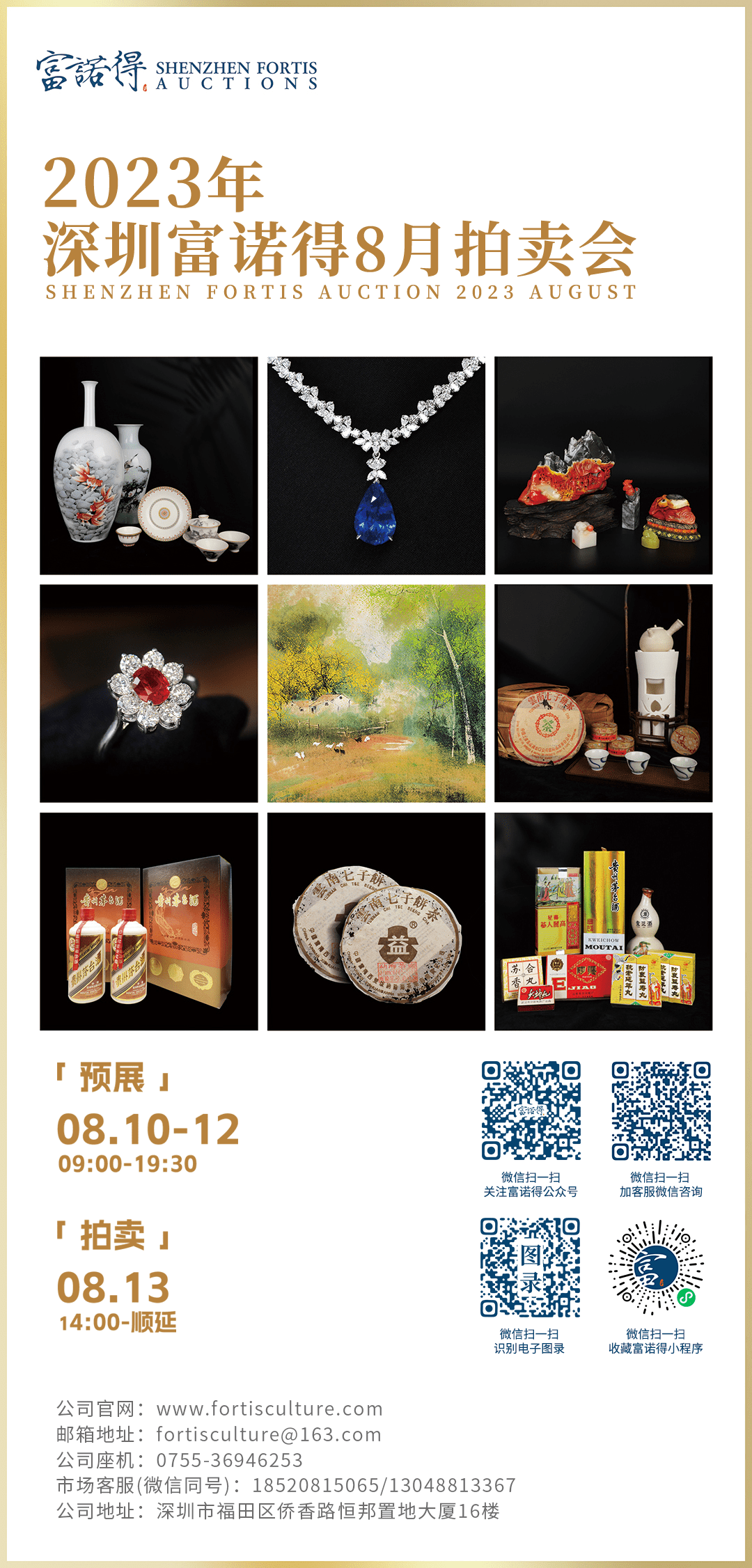 据了解,深圳富诺得2023“8月拍”拍卖会预展暨“秋拍精品展”现已于深圳富诺得艺术中心正式拉开帷幕,8月10日-12日可免费免预约现场观看预展,8月13日14时正式开拍。此次“8月拍”拍卖会推出六大专题,涵盖中国书画、当代名家瓷艺、寿山、青田俏色赏石、佳茗茶器、滋补养生品等332件精选拍品,许多大众艺术品将逐一走上拍卖台。