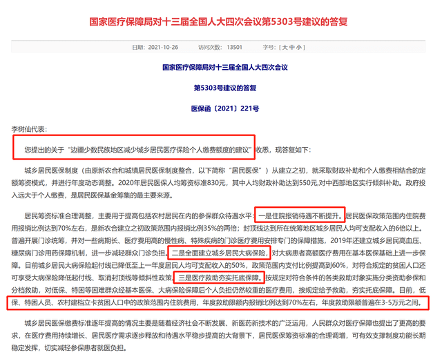 除此之外,在2021年的回复中还提到,针对边疆少数民族地区,低保、特困人员、农村建档立卡贫困人口中的政策范围内住院费用,年度救助限额内报销比例达到70%左右,年度救助限额普遍在3-5万元之间。