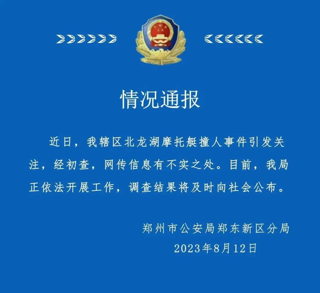 ●“郑东公安”8月12日发布一则情况通报称,近日,其辖区北龙湖摩托艇撞人事件引发关注,经初查,网传信息有不实之处。目前,郑东新区分局正依法开展工作,调查结果将及时向社会公布。