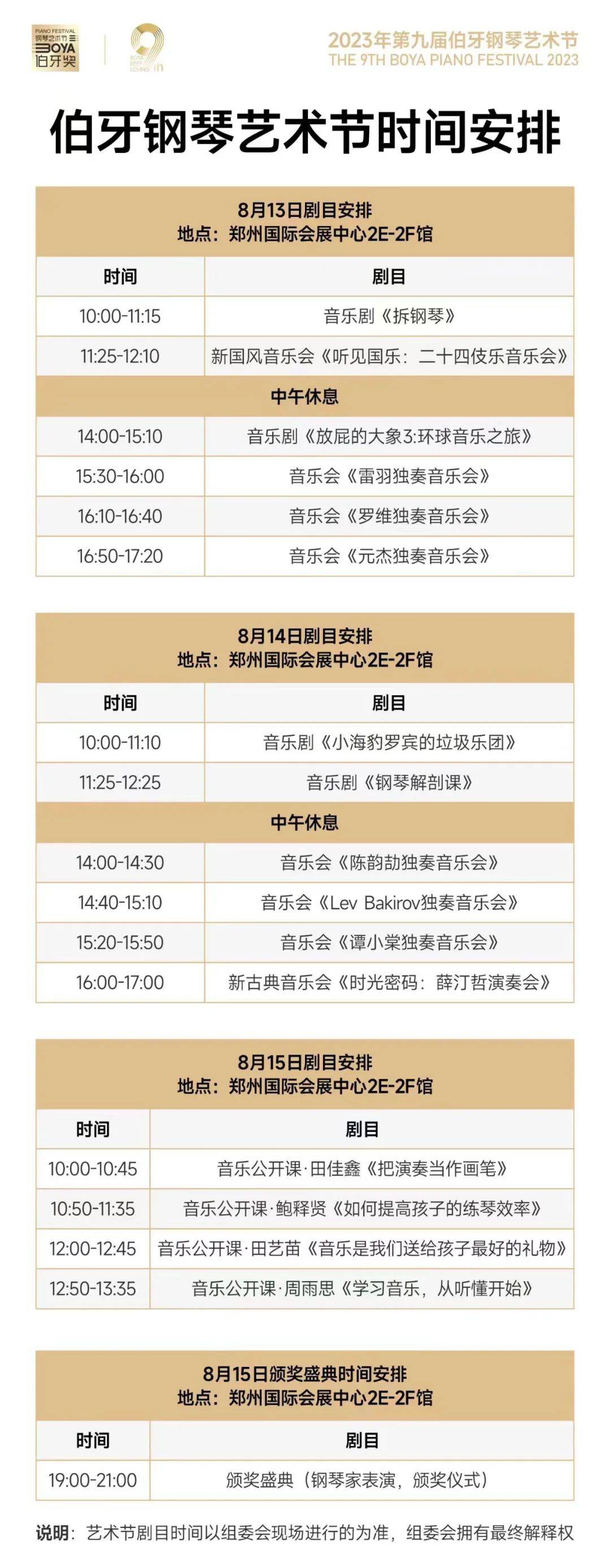 ●2023伯牙钢琴艺术节全国总决赛将于8月13日至15日,在郑州国际会展中心正式开赛。2019年伯牙钢琴艺术节曾在郑州举办,时隔4年,来自全国各地的选手们再次相聚郑州,为观众献上一场高水平的艺术盛宴。